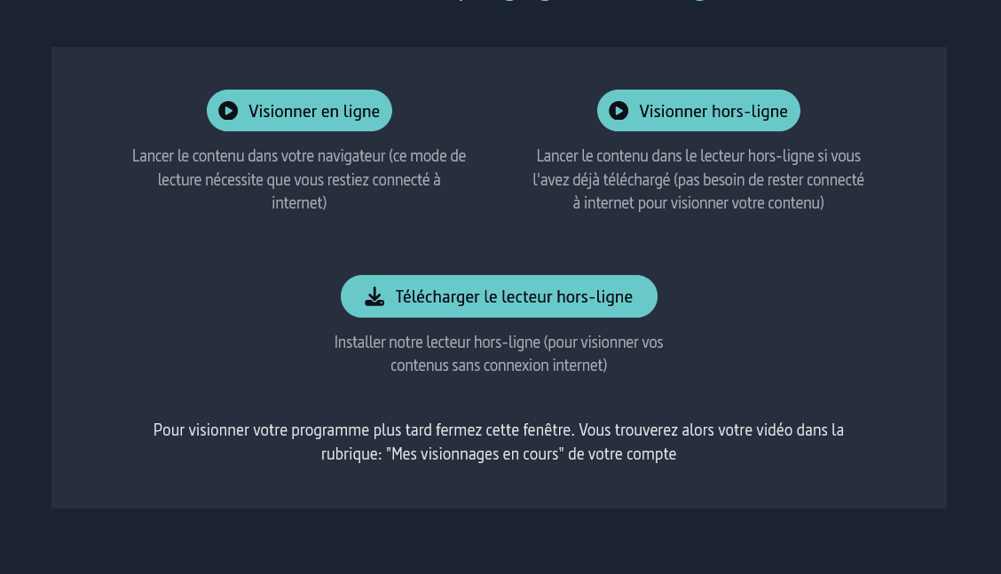 Vous pouvez désormais télécharger le programme. Une fois le téléchargement fait vous disposer de 48h à compter de la première lecture du film puis le fichier téléchargé disparaîtra de votre ordinateur.