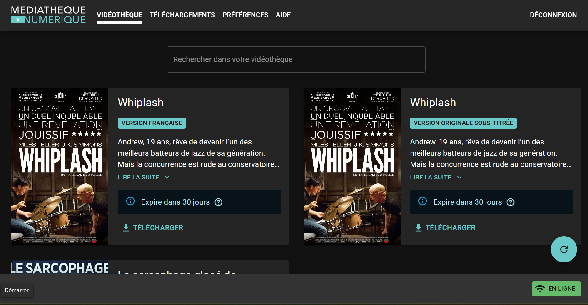 Une fois vos identifiants saisi, l'application s’ouvre et vous propose les films que vous avez loués.